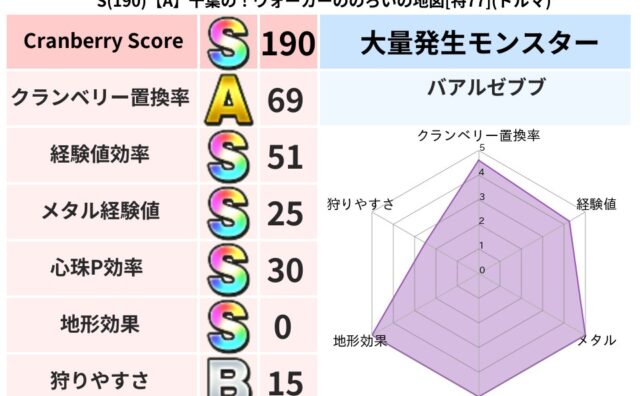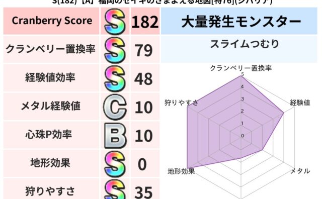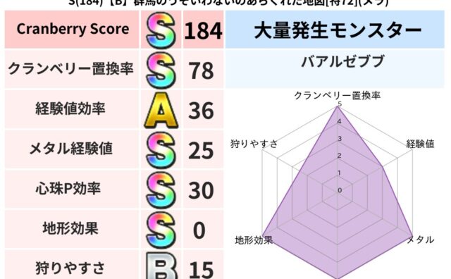 クランベリーボット判定結果の詳細クランベリースコア188クランベリー置換率62%大量発生モンスターじごくのもんばん超耐性ヒャド(0%)超耐性・弱耐性なしバギドルマこころ道 完全一致モンスターどくろあらいゴッドハンド(守護道Lv5)キメラ大魔...