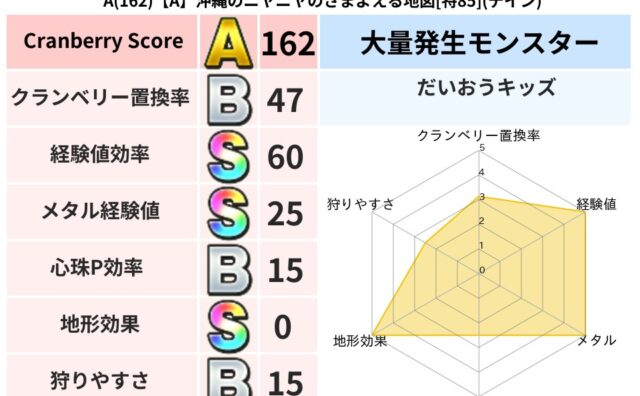 未分類 A(162)【A】沖縄のニヤニヤのさまよえる地図[特85](デイン) クランベリーボット判定結果の詳細クランベリースコア162クランベリー置換率47%大量発生モンスターだいおうキッズ超耐性デイン(0%)超耐性・弱耐性なしジバリア系統狩りけもの系42%こころ道 完全一致モンスターナイトキャット守り人(まもり道L... 2026/04/24 09:07 未分類