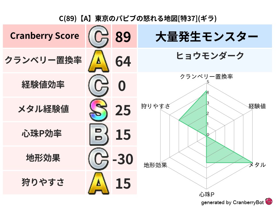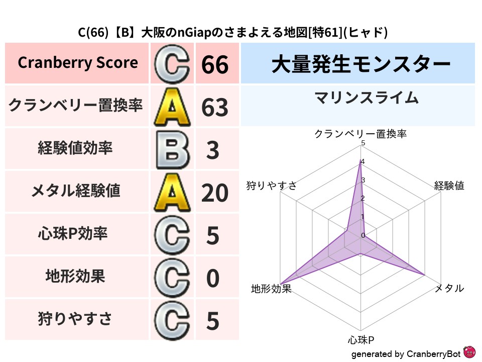 C(85)【A】神奈川のサボテンのざわめく地図[特65](ジバリア) 地図判定結果 2024/07/10 21:152025/06/28 15:16 地図判定結果 ジバリアナスビナーラ (まだ評価がありません)読み込み中... 🤍 登録する コメントを見る(0件)クランベリーボット判定結果の詳細 クランベリースコア:85 クランベリー置換率:62% 大量発生モンスター:ナスビナーラ ジバリア超耐性(0%) こころ道 完全一致モンスター ばくだん岩: 大神官(舞道Lv5) しりょうのきし: 大神官(舞道Lv5) かっちゅうアリ: 魔人(共通Lv1) スマイルロック: 守り人(ささえ道Lv10) ミミック: ドラゴン(人道Lv20) ナスビナーラ: 守り人(ささえ道Lv5) ベビル: 大神官(祈道Lv40) この地図を探す・受け取る Discordの判定結果を見る 「神奈川のサボテンのざわめく地図」をみんドラで探す