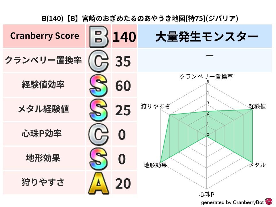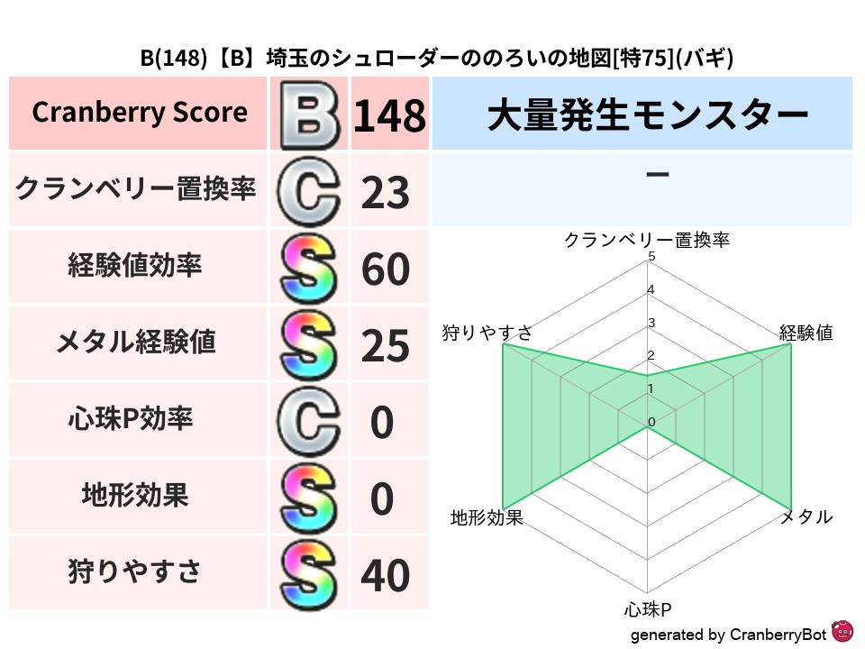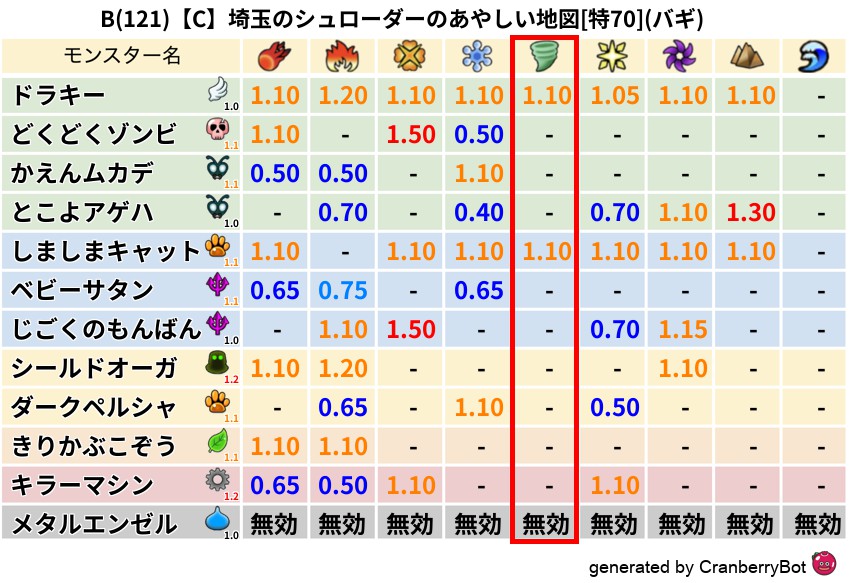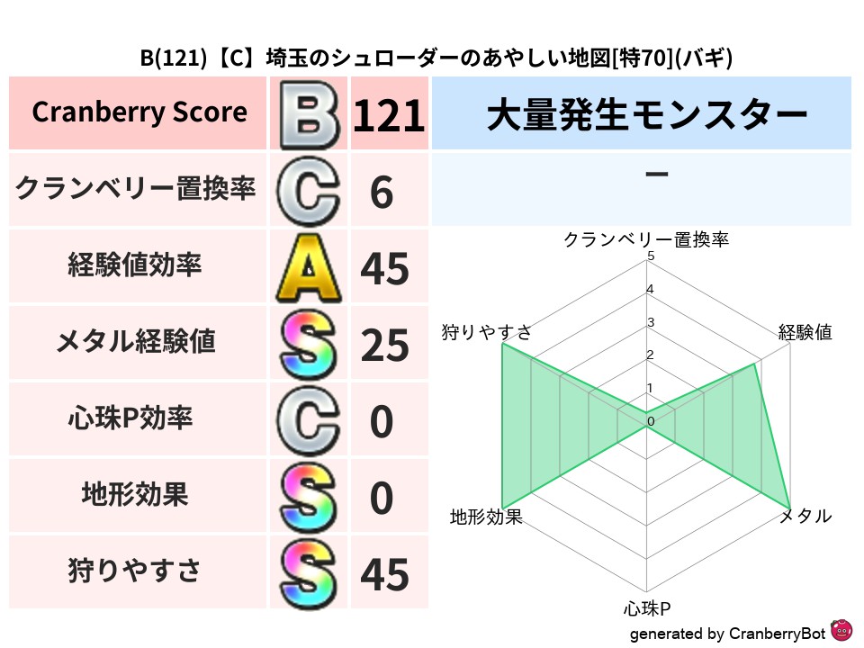 B(121)【C】埼玉のシュローダーのあやしい地図[特70](バギ) 地図判定結果 2025/09/24 22:24 地図判定結果 バギ (まだ評価がありません)読み込み中... 🤍 登録する コメントを見る(0件)クランベリーボット判定結果の詳細 クランベリースコア:121 クランベリー置換率:6% バギ超耐性(0%) 超耐性・弱耐性なし:イオ,ドルマ,ジバリア 系統狩り[虫系](41%) こころ道 完全一致モンスター ドラキー: 大魔導士(共通Lv1) どくどくゾンビ: 魔剣士(共通Lv1) しましまキャット: ニンジャ(共通Lv1) シールドオーガ: ニンジャ(波道Lv20) ダークペルシャ: 魔人(超人道Lv20) メタルエンゼル: 守り人(ささえ道Lv60) この地図を探す・受け取る Discordの判定結果を見る 「埼玉のシュローダーのあやしい地図」をみんドラで探す