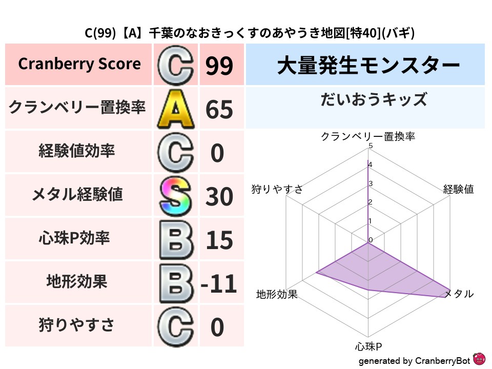 | 判定 | スコア | 地図名 | レベル | 属性 | Discord | 139 | 【C】沖縄のぴーすけのゆらめく地図 | 特60 | ドルマ | link | 138 | 【A】北海道のMarioのねむれる地図 | 特59 | バギ | link | 123 | 【A】宮城のくそじょのさまよえる地図 | 特60 | バギ | link | 119 | 【C】新潟のクソジジイのあらくれた地図 | 特60 | メラ | link | 105 | 【B】山口のアキのあらくれた地図 | 特57 | ジバリア | link |