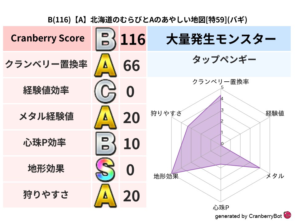 | 判定 | スコア | 地図名 | レベル | 属性 | Discord | 163 | 【A】東京のよっかのあらくれた地図 | 特60 | ギラ | link | 136 | 【A】北海道のむらびとAのあやしい地図 | 特59 | バギ | link | 107 | 【B】福岡のラウナーのあらくれた地図 | 特56 | イオ | link | 104 | 【B】神奈川のオツカレのあらくれた地図 | 特56 | イオ | link | 101 | 【A】東京のよっかのゆらめく地図 | 特60 | デイン | link |