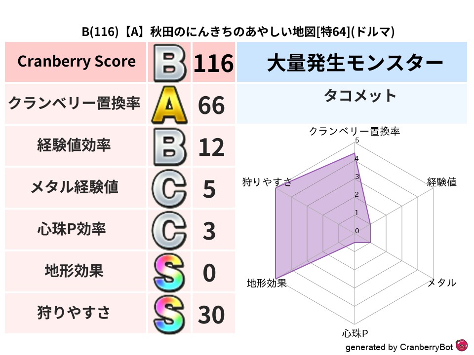 | 判定 | スコア | 地図名 | レベル | 属性 | Discord | 136 | 【A】秋田のにんきちのあやしい地図 | 特64 | ドルマ | link | 122 | 【B】大阪のBrookのさまよえる地図 | 特60 | イオ | link | 112 | 【A】茨城のダージリンののろいの地図 | 特65 | ドルマ | link | 106 | 【A】岐阜のヒロのあらくれた地図 | 特65 | イオ | link | 106 | 【A】岡山のぬぴのさまよえる地図 | 特62 | ドルマ | link |