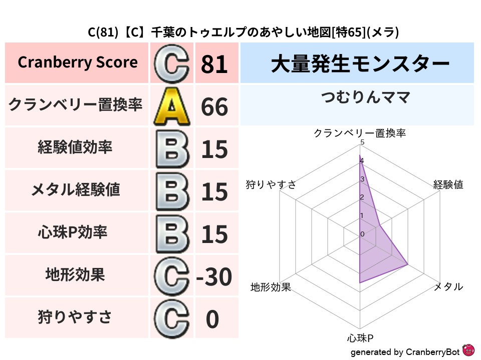 | 判定 | スコア | 地図名 | レベル | 属性 | Discord | 159 | 【A】神奈川のrainのあらくれた地図 | 特61 | バギ | link | 140 | 【C】北海道のふるちゃんのあやしい地図 | 特59 | デイン | link | 133 | 【C】山口のわちくのねむれる地図 | 特65 | ドルマ | link | 114 | 【B】岡山のスパロウのざわめく地図 | 特65 | バギ | link | 111 | 【C】千葉のトゥエルプのあやしい地図 | 特65 | メラ | link |