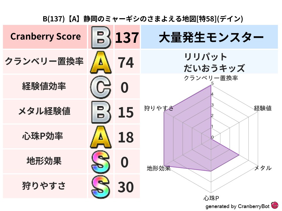 | 判定 | スコア | 地図名 | レベル | 属性 | Discord | 153 | 【B】東京のえいごであそのあやしい地図 | 特64 | イオ | link | 151 | 【A】静岡のミャーギシのさまよえる地図 | 特58 | デイン | link | 139 | 【A】北海道のまっちゃののろいの地図 | 特42 | デイン | link | 139 | 【B】北海道ののぶひこのあやしい地図 | 特62 | ジバリア | link | 137 | 【B】千葉のめがっちのねむれる地図 | 特62 | イオ | link |