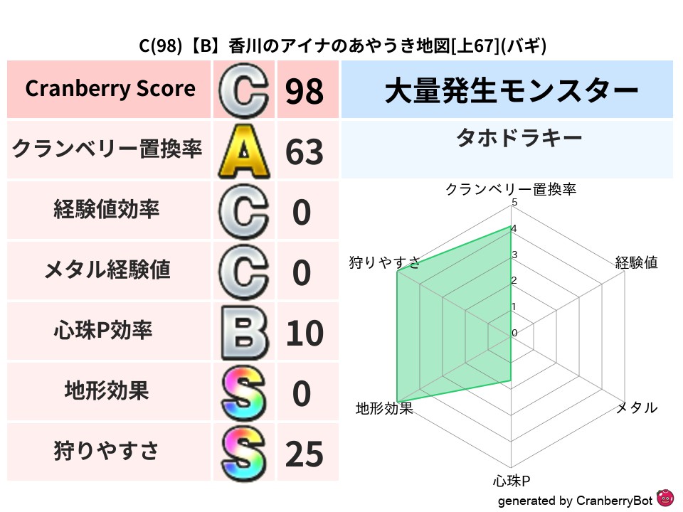| 判定 | スコア | 地図名 | レベル | 属性 | Discord | 187 | 【A】岐阜のエルムのゆらめく地図 | 特68 | ドルマ | link | 174 | 【A】福島のはらちゃんのあらくれた地図 | 特70 | デイン | link | 149 | 【A】沖縄のざーにかのあらくれた地図 | 特67 | デイン | link | 146 | 【A】大分のどうせつのあらくれた地図 | 特66 | デイン | link | 141 | 【B】長野のdragonのさまよえる地図 | 特56 | ギラ | link |