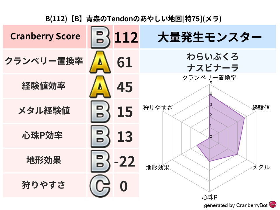 | 判定 | スコア | 地図名 | レベル | 属性 | Discord | 153 | 【B】埼玉のせいじんのあらくれた地図 | 特75 | ドルマ | link | 144 | 【C】北海道のうたのあやしい地図 | 特74 | メラ | link | 143 | 【C】茨城のさとしのざわめく地図 | 特75 | バギ | link | 133 | 【A】静岡のえむきちのあやしい地図 | 特69 | ドルマ | link | 131 | 【C】山梨のよこちんのざわめく地図 | 特74 | ドルマ | link |
