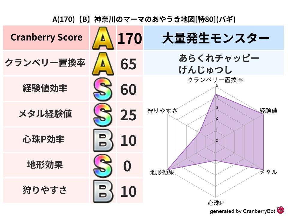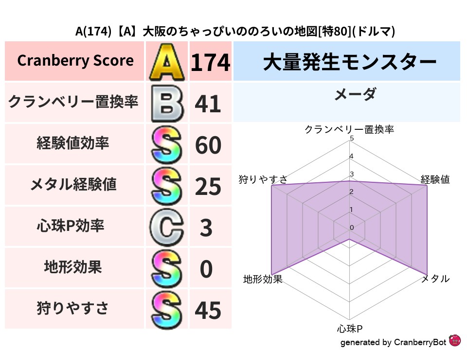 | 判定 | スコア | 地図名 | レベル | 属性 | 174 | 【A】大阪のちゃっぴいののろいの地図 | 特80 | ドルマ | 146 | 【B】東京のきゅーぽんのあやしい地図 | 特80 | デイン | 140 | 【C】埼玉のクロノのはかなき地図 | 特77 | デイン | 137 | 【B】東京のアマチョのあやしい地図 | 特72 | ドルマ | 135 | 【A】兵庫のロナのさまよえる地図 | 特79 | ドルマ |