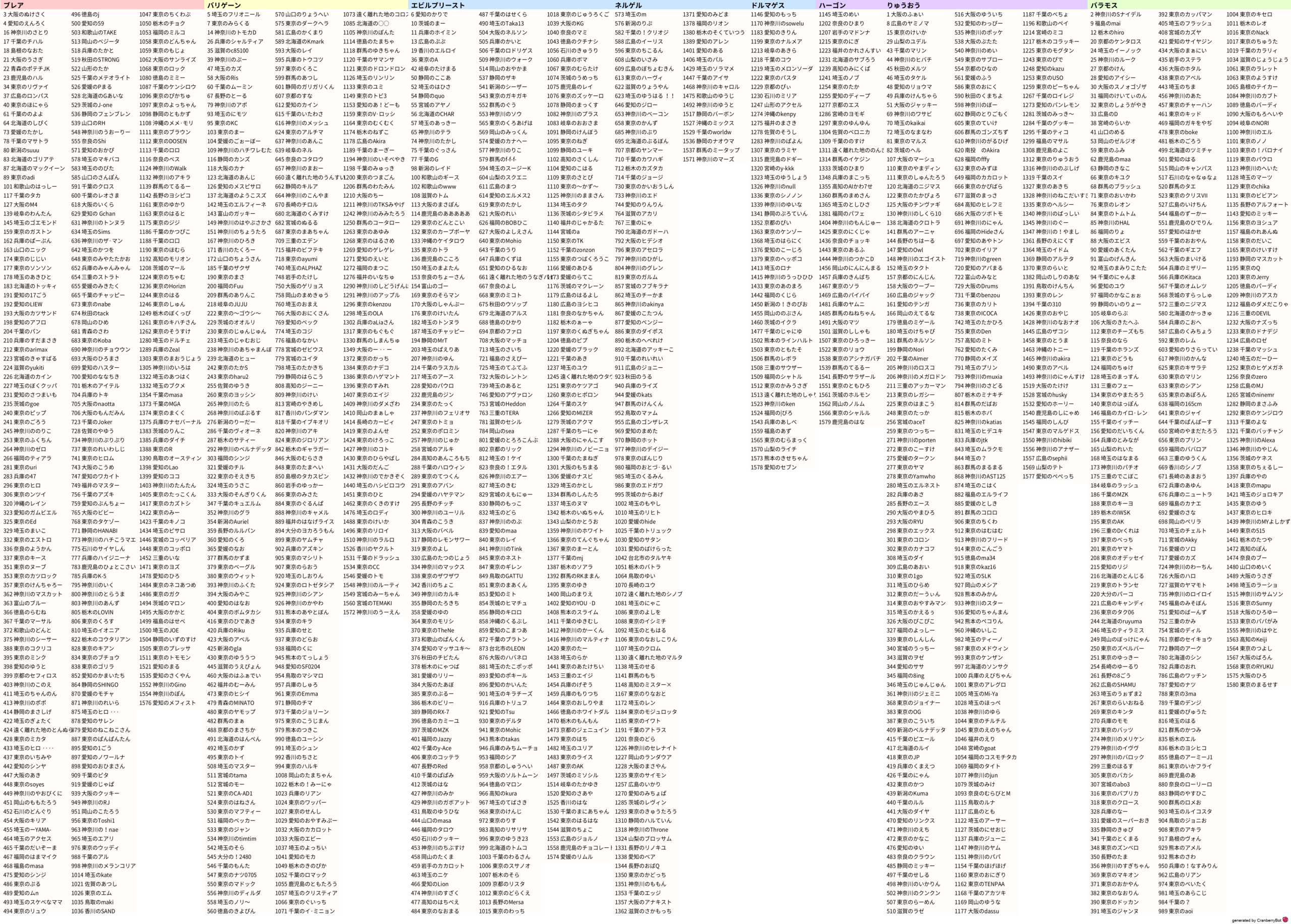 | 77 | 【A】北海道のヤマネコのあらくれた地図 | 特72 | ジバリア | 77 | 【C】東京のがんちゃんののろいの地図 | 特77 | メラ | 77 | 【B】徳島のりくまるのゆらめく地図 | 特76 | ヒャド | 77 | 【B】大阪のかざみどりのさまよえる地図 | 特70 | ヒャド | 76 | 【A】東京のばぁねっとのあやうき地図 | 特79 | ジバリア | 76 | 【C】京都のアキラスのはかなき地図 | 特80 | ヒャド | 73 | 【A】北海道の!クロエののろいの地図 | 特79 | ギラ | 73 | 【B】愛知のりえのあやしい地図 | 特70 | デイン | 72 | 【B】熊本のプチャラティのさまよえる地図 | 特79 | バギ | 72 | 【B】長野のR·もょもとののろいの地図 | 特75 | ドルマ | 72 | 【B】鳥取のりくまるのねむれる地図 | 特78 | メラ | 71 | 【B】東京のかおりんのねむれる地図 | 特79 | バギ | 71 | 【C】鳥取のミカンのゆらめく地図 | 特80 | メラ | 70 | 【C】千葉のKホールのざわめく地図 | 特79 | ジバリア | 70 | 【C】福岡のアイリンのねむれる地図 | 特75 | ジバリア | 69 | 【C】鳥取の!まうきちのゆらめく地図 | 特79 | ギラ | 69 | 【C】鳥取の!まうきちのちいさき地図 | 特69 | イオ | 69 | 【A】東京のえいごであそのあやうき地図 | 特79 | ヒャド | 68 | 【B】大阪のかざみどりののろいの地図 | 特79 | ギラ | 67 | 【A】埼玉のツボリーヌのあらくれた地図 | 特76 | メラ | 67 | 【A】東京のたかひろののろいの地図 | 特73 | ドルマ | 67 | 【A】東京のはるのあらくれた地図 | 特70 | イオ | 66 | 【A】埼玉のおにくのさまよえる地図 | 特74 | ギラ | 66 | 【B】神奈川のフェニクルスのあらくれた地図 | 特80 | デイン | 66 | 【A】神奈川のみーなのあやうき地図 | 特78 | ジバリア | 65 | 【B】茨城のチャンボのあらくれた地図 | 特74 | ドルマ | 65 | 【A】群馬のユキカゼのゆらめく地図 | 特75 | ジバリア | 65 | 【A】北海道のほたるののろいの地図 | 特80 | イオ | 64 | 【A】岡山のくおんのねむれる地図 | 特77 | ヒャド | 64 | 【B】埼玉のエリセルのゆらめく地図 | 特80 | デイン | 64 | 【C】台中市のひこのさまよえる地図 | 特80 | ヒャド | 64 | 【C】東京のやまいりむらのあらくれた地図 | 特78 | ヒャド | 64 | 【C】沖縄のMSKのさまよえる地図 | 特80 | ヒャド | 64 | 【B】高知のどんちゃんののろいの地図 | 特68 | バギ | 63 | 【A】神奈川のねこアレのあやうき地図 | 特76 | ジバリア | 63 | 【A】千葉のえだまめのあらくれた地図 | 特73 | ギラ | 63 | 【A】東京のぽりんのさまよえる地図 | 特80 | ドルマ | 62 | 【A】愛知の18ごうのあらくれた地図 | 特76 | デイン | 62 | 【B】大阪のジュンクロのあらくれた地図 | 特80 | メラ | 62 | 【B】鹿児島のここのあらくれた地図 | 特77 | ヒャド | 62 | 【A】山形のひなぴょんのあやうき地図 | 特80 | ヒャド | 62 | 【B】東京のぽぽのざわめく地図 | 特80 | ヒャド | 61 | 【B】福岡のポヨポヨのあらくれた地図 | 特74 | バギ | 61 | 【A】北海道のもものあやうき地図 | 特79 | ギラ | 60 | 【A】埼玉のアディおののろいの地図 | 特80 | ヒャド | 60 | 【A】奈良のスバルのあらくれた地図 | 特76 | ギラ | 59 | 【A】埼玉のダーコリのあらくれた地図 | 特80 | メラ | 59 | 【B】神奈川の!すたあのゆらめく地図 | 特76 | ヒャド | 59 | 【A】神奈川のうまこののろいの地図 | 特80 | ジバリア | 58 | 【B】鹿児島のあきちゃのあやうき地図 | 特80 | デイン |