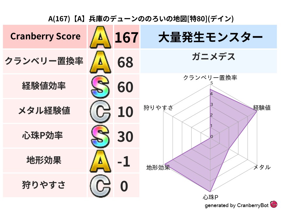 | 判定 | スコア | 地図名 | レベル | 属性 | 167 | 【A】兵庫のデューンののろいの地図 | 特80 | デイン | 149 | 【B】愛知ののあずのあらくれた地図 | 特80 | デイン | 143 | 【A】宮城のゆずきんのさまよえる地図 | 特80 | ギラ | 135 | 【A】東京のみみみのあやうき地図 | 特73 | ヒャド | 133 | 【A】山梨のかばやきのあらくれた地図 | 特72 | バギ |