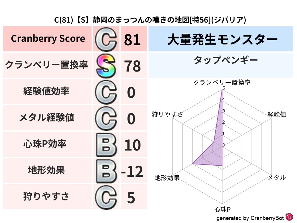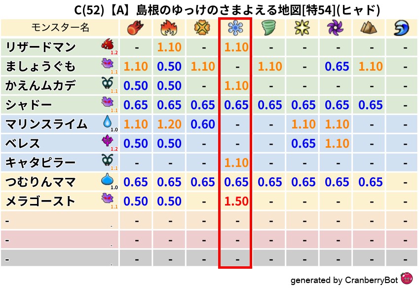 C(52)【A】島根のゆっけのさまよえる地図[特54](ヒャド) 地図判定結果 2024/04/26 21:042025/10/23 12:34 地図判定結果 ヒャドマリンスライム (まだ評価がありません)読み込み中... 🤍 登録する コメントを見る(0件)クランベリーボット判定結果の詳細 クランベリースコア52 クランベリー置換率60% 大量発生モンスターマリンスライム 超耐性ヒャド(0%) こころ道 完全一致モンスター シャドーニンジャ(波道Lv30) ベレス魔剣士(刃道Lv10) キャタピラーニンジャ(風道Lv40) つむりんママ魔人(超魔道Lv20) メラゴースト大神官(舞道Lv20) この地図を探す・受け取る 「島根のゆっけのさまよえる地図」をみんドラで探す