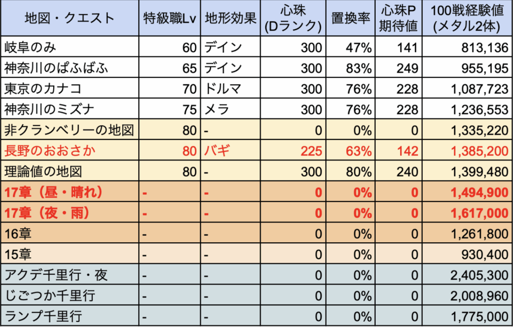 地図・クエストの経験値効率17章の経験値は、100戦でざっくり150万exp!