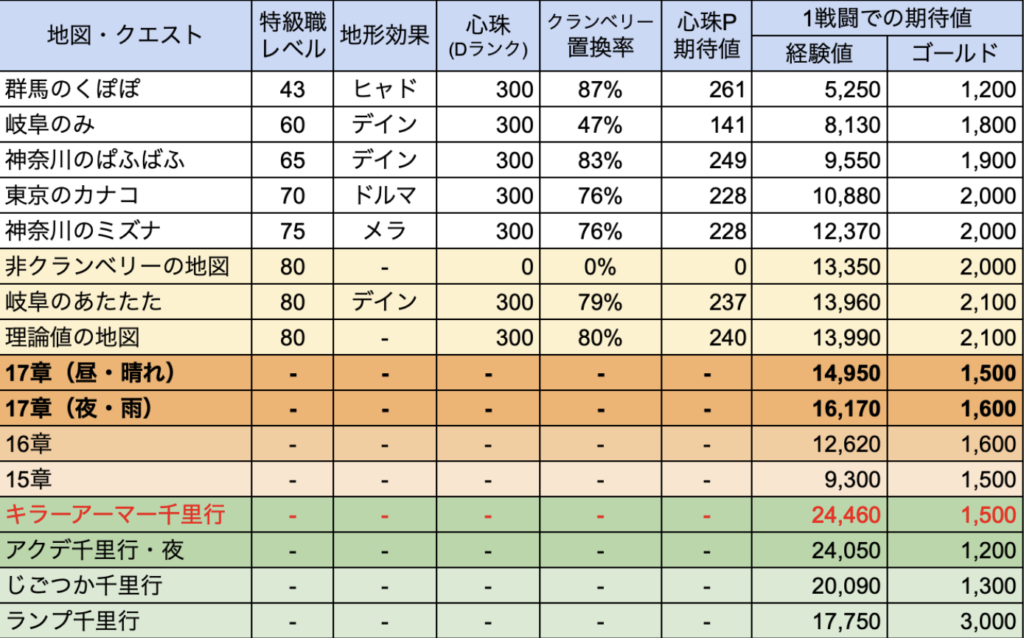 宝の地図の経験値効率(2025/12/12) 地図・クエストの経験値効率 2025/12/12 21:42 地図・クエストの経験値効率 キラーアーマー千里行の経験値効率を追加!経験値もゴールドもアークデーモン千里行よりちょっと上がってるけど、周回効率の良い方が良さそう!