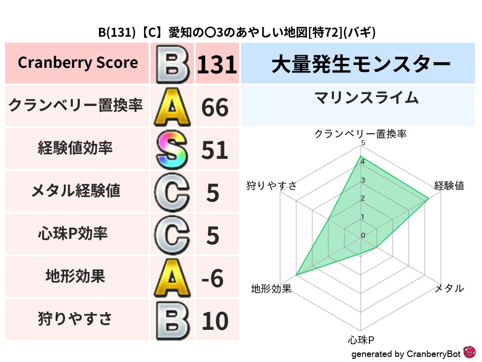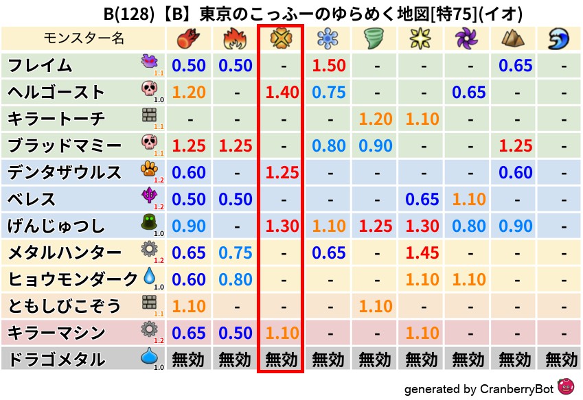 B(128)【B】東京のこっふーのゆらめく地図[特75](イオ) 地図判定結果 2025/09/26 17:32 地図判定結果 イオ (まだ評価がありません)読み込み中... 🤍 登録する コメントを見る(0件)クランベリーボット判定結果の詳細 クランベリースコア:128 クランベリー置換率:23% イオ超耐性(0%) 系統狩り[ゾンビ系](47%) こころ道 完全一致モンスター フレイム: 守り人(ささえ道Lv5) デンタザウルス: 大神官(舞道Lv10) ベレス: 魔剣士(刃道Lv10) メタルハンター: 魔剣士(刃道Lv40) ヒョウモンダーク: 大魔導士(魔力道Lv30) ともしびこぞう: 魔剣士(魔道Lv40) ドラゴメタル: ゴッドハンド(守護道Lv30) この地図を探す・受け取る 「東京のこっふーのゆらめく地図」をみんドラで探す