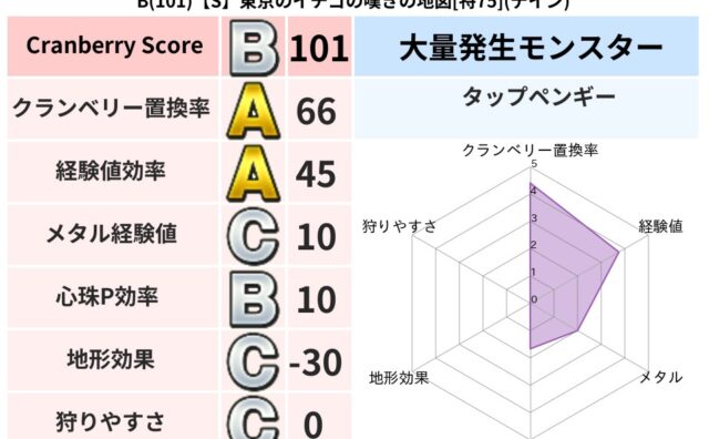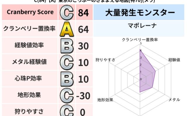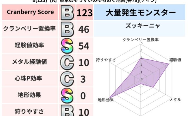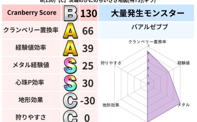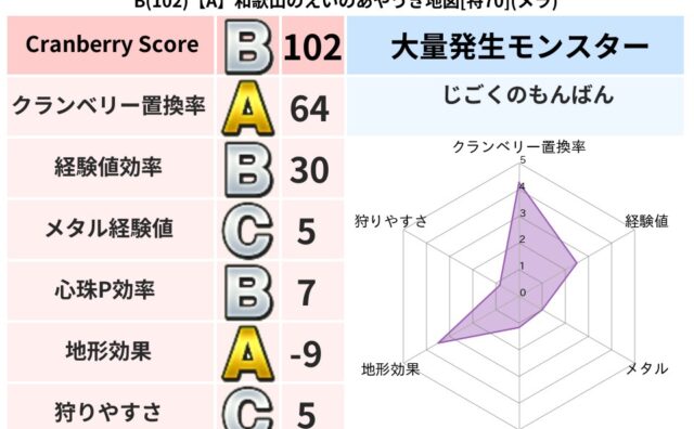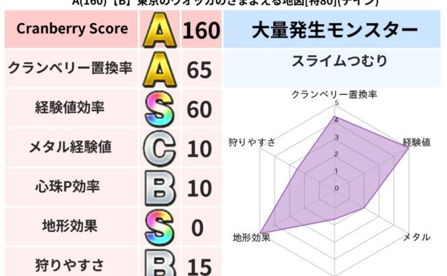 クランベリーボット判定結果の詳細クランベリースコア160クランベリー置換率65%大量発生モンスタースライムつむり超耐性デイン(0%)超耐性・弱耐性なしバギこころ道 完全一致モンスターストーンマンゴッドハンド(守護道Lv5)だいまどうゴッドハ...