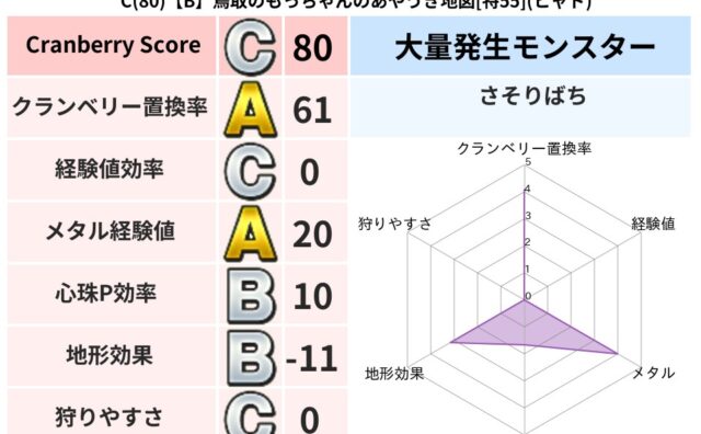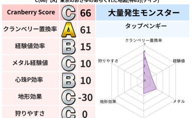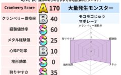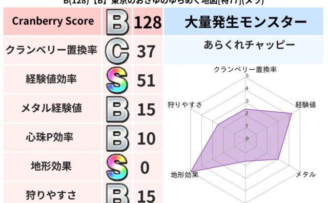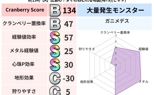 クランベリーボット判定結果の詳細クランベリースコア130クランベリー置換率50%大量発生モンスタータップペンギー超耐性メラ(8%)こころ道 完全一致モンスタードロヌーバニンジャ(波道Lv5)がいこつ魔剣士(共通Lv1)ダースドラゴン天地雷鳴...