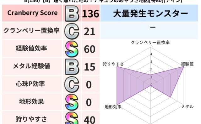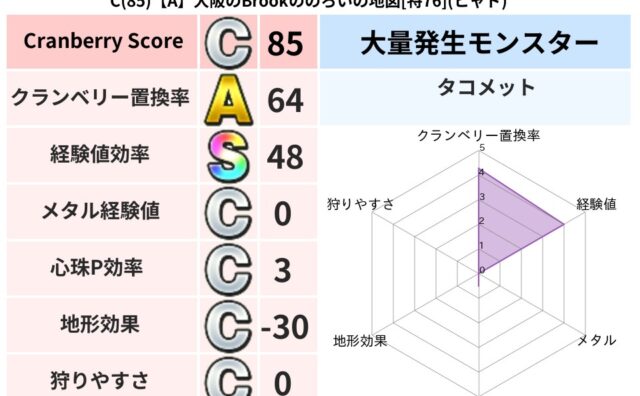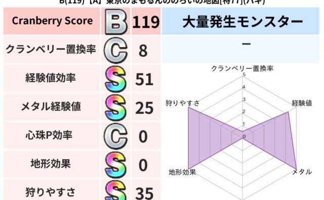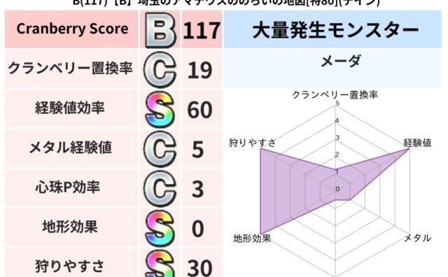 クランベリーボット判定結果の詳細クランベリースコア117クランベリー置換率19%大量発生モンスターメーダ超耐性デイン(0%)こころ道 完全一致モンスターメーダドラゴン(共通Lv1)がいこつ魔剣士(共通Lv1)びっくりサタン大神官(共通Lv1...