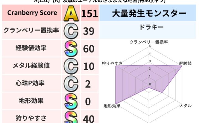 クランベリーボット判定結果の詳細クランベリースコア111クランベリー置換率66%大量発生モンスターつむりんママ超耐性メラ(56%)こころ道 完全一致モンスターかっちゅうアリ魔人(共通Lv1)グリゴンダンス魔人(超魔道Lv5)スマイルロック守...