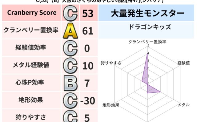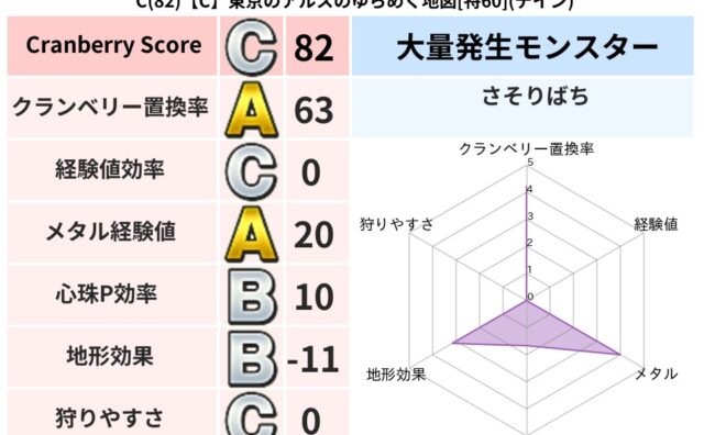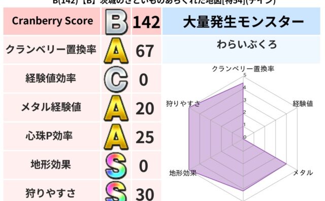 クランベリーボット判定結果の詳細クランベリースコア:100クランベリー置換率:63%大量発生モンスター:バアルゼブブイオ超耐性(39%)こころ道 完全一致モンスターくさった死体ゴッドハンド(守護道Lv5),大魔導士(魔力道Lv5)ヒートギズ...