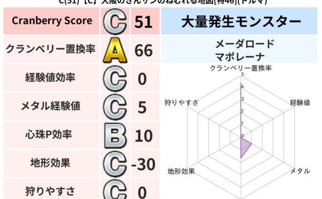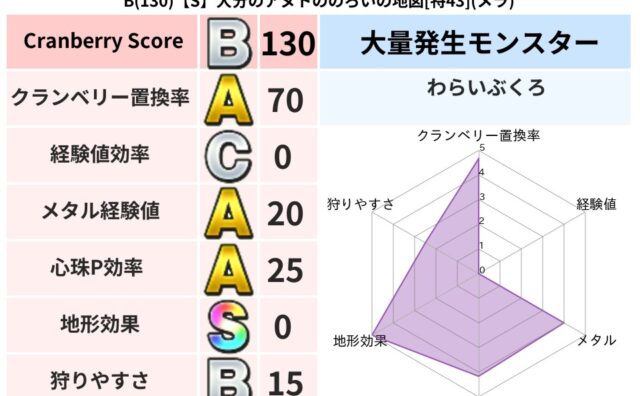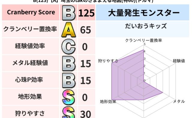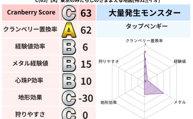 クランベリーボット判定結果の詳細クランベリースコア63クランベリー置換率62%大量発生モンスタータップペンギー超耐性イオ(0%)こころ道 完全一致モンスターさまようよろいゴッドハンド(守護道Lv5)デビルアーマー大神官(舞道Lv5)アイアン...