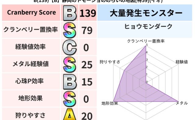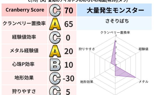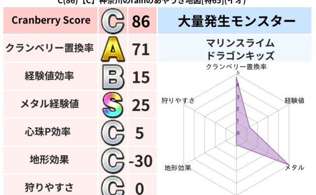 クランベリーボット判定結果の詳細クランベリースコア:116クランベリー置換率:66%大量発生モンスター:メトロゴーストバギ超耐性(0%)系統狩り(41%)こころ道 完全一致モンスターかっちゅうアリ: 魔人(共通Lv1)グリゴンダンス: 魔人...