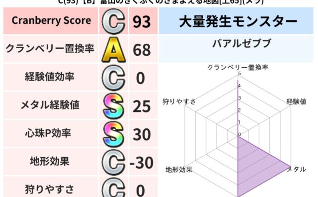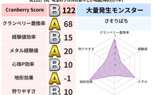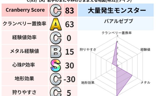 クランベリーボット判定結果の詳細クランベリースコア:112クランベリー置換率:63%大量発生モンスター:メーダロードバギ超耐性(1%)こころ道 完全一致モンスターデビルアーマー大神官(舞道Lv5)ジェリーマン魔剣士(魔道Lv5)フロストギズ...