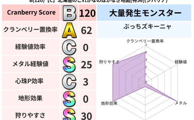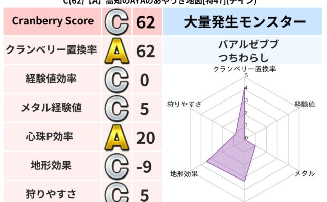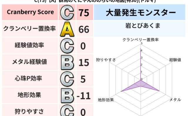 クランベリーボット判定結果の詳細クランベリースコア:83クランベリー置換率:62%大量発生モンスター:バアルゼブブ,つちわらしデイン超耐性(0%)こころ道 完全一致モンスターアイアンクック: 守り人(まもり道Lv5)ドロヌーバ: ニンジャ(...