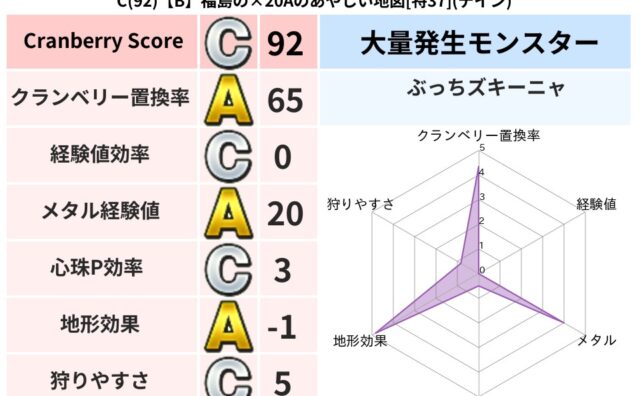 クランベリーボット判定結果の詳細クランベリースコア:138クランベリー置換率:60%大量発生モンスター:タホドラキージバリア超耐性(0%)こころ道 完全一致モンスターどれいへいし: ドラゴン(人道Lv5)ストーンマン: ゴッドハンド(守護道...