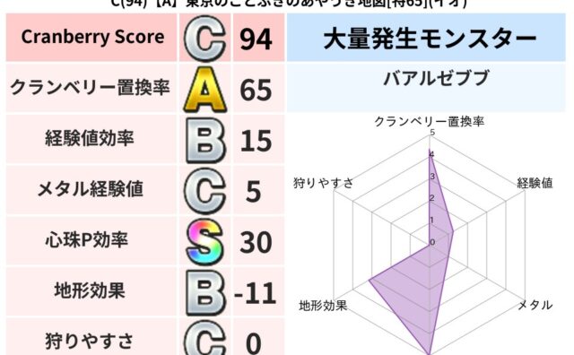 クランベリーボット判定結果の詳細クランベリースコア94クランベリー置換率65%大量発生モンスターバアルゼブブ超耐性イオ(18%)こころ道 完全一致モンスターばくだん岩大神官(舞道Lv5)キースドラゴン大魔道士(理力道Lv5)ヘルボックル魔剣...