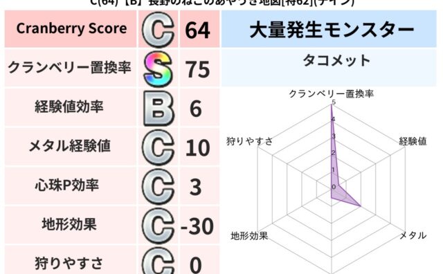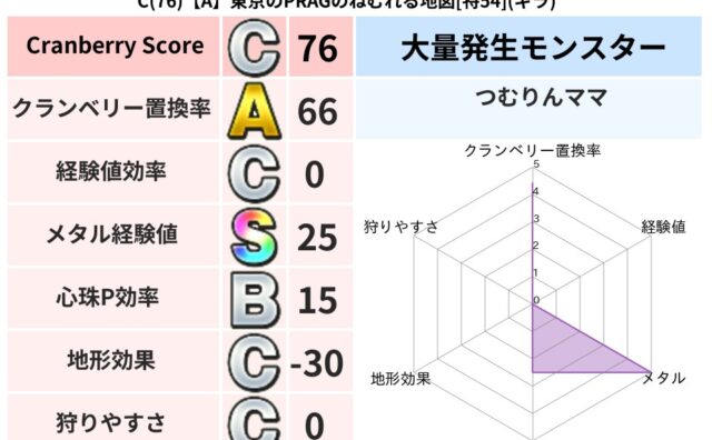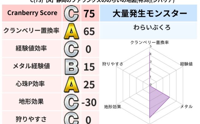 クランベリーボット判定結果の詳細クランベリースコア:88クランベリー置換率:68%大量発生モンスター:ナスビナーラドルマ超耐性(10%)こころ道 完全一致モンスターキャットフライニンジャ(共通Lv1)デビルアーマー大神官(舞道Lv5)マミー...
