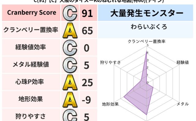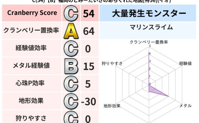クランベリーボット判定結果の詳細クランベリースコア:76クランベリー置換率:62%大量発生モンスター:マポレーナデイン超耐性(0%)こころ道 完全一致モンスターキャットフライ: ニンジャ(共通Lv1)さまようよろい: ゴッドハンド(守護道L...