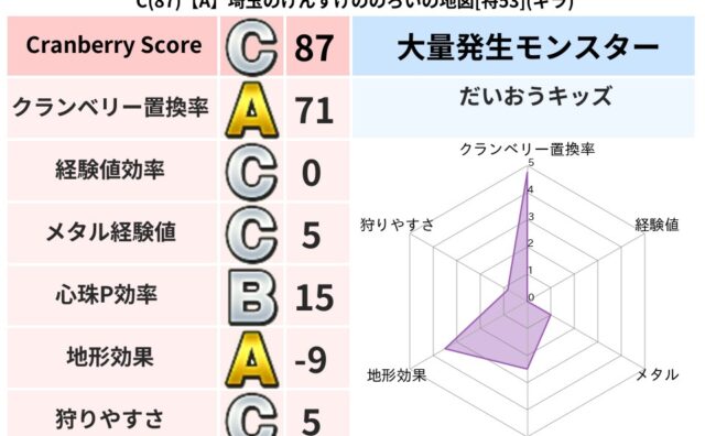 クランベリーボット判定結果の詳細クランベリースコア88クランベリー置換率68%大量発生モンスターバアルゼブブ超耐性イオ(50%)こころ道 完全一致モンスターギズモ天地雷鳴士(共通Lv1)かっちゅうアリ魔人(共通Lv1)ジェリーマン魔剣士(魔...