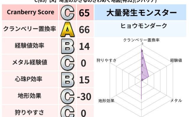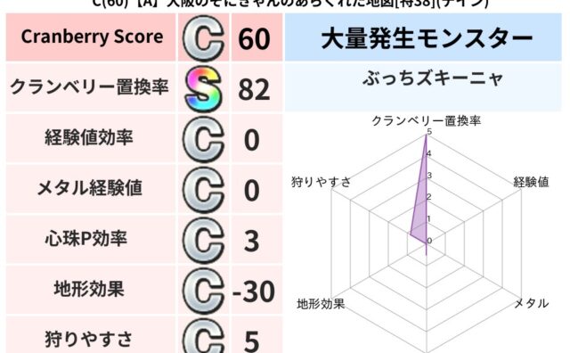 クランベリーボット判定結果の詳細クランベリースコア:87クランベリー置換率:63%大量発生モンスター:だいおうキッズ,ヒョウモンダークジバリア超耐性(46%)系統狩り(42%)こころ道 完全一致モンスターみならいあくまニンジャ(風道Lv5)...