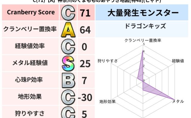 クランベリーボット判定結果の詳細クランベリースコア:76クランベリー置換率:63%大量発生モンスター:バアルゼブブヒャド超耐性(51%)こころ道 完全一致モンスターみならいあくまニンジャ(風道Lv5)ストーンマンゴッドハンド(守護道Lv5)...