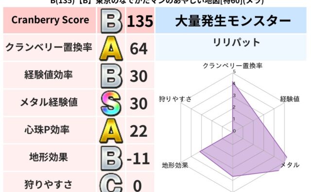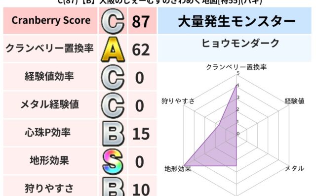 クランベリーボット判定結果の詳細クランベリースコア:81クランベリー置換率:61%大量発生モンスター:タホドラキーヒャド超耐性(46%)系統狩り(42%)こころ道 完全一致モンスターどくろあらいゴッドハンド(守護道Lv5)かっちゅうアリ魔人...