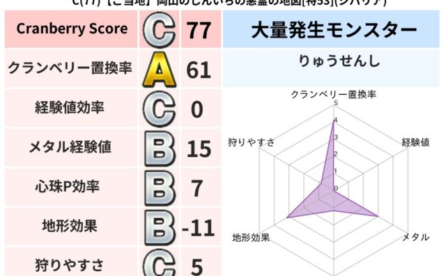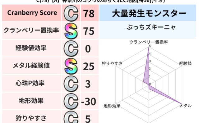 クランベリーボット判定結果の詳細クランベリースコア78クランベリー置換率75%大量発生モンスターぶっちズキーニャ超耐性イオ(42%)こころ道 完全一致モンスターどくどくゾンビ魔剣士(共通Lv1)ストーンマンゴッドハンド(守護道Lv5)リカン...