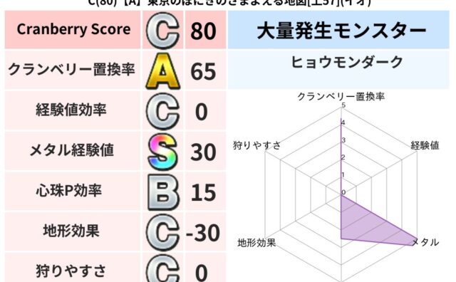 クランベリーボット判定結果の詳細クランベリースコア70クランベリー置換率63%大量発生モンスターリリパット超耐性ジバリア(38%)こころ道 完全一致モンスターどくろあらいゴッドハンド(守護道Lv5)どれいへいしドラゴン(人道Lv5)リカント...