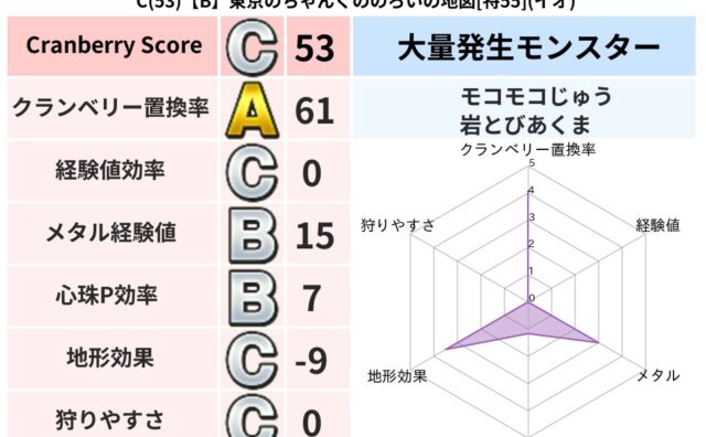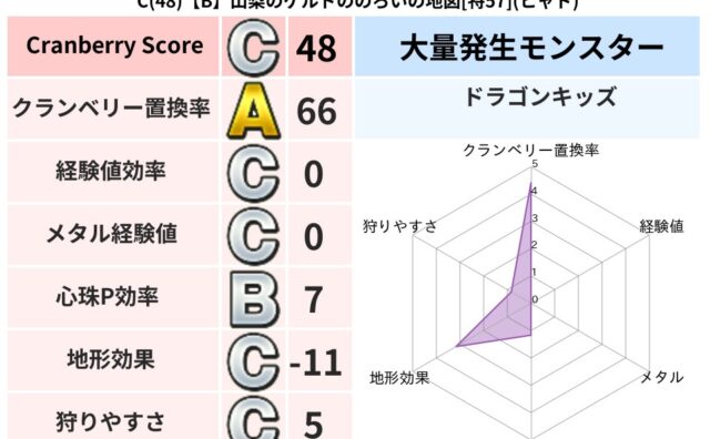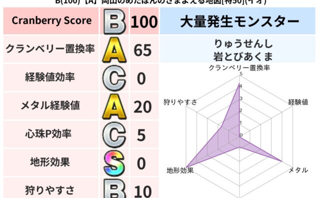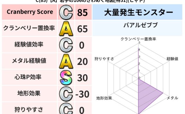 クランベリーボット判定結果の詳細クランベリースコア85クランベリー置換率65%大量発生モンスターバアルゼブブ超耐性ヒャド(80%)こころ道 完全一致モンスターデビルアーマー大神官(舞道Lv5)ばくだん岩大神官(舞道Lv5)アイアンクック守り...