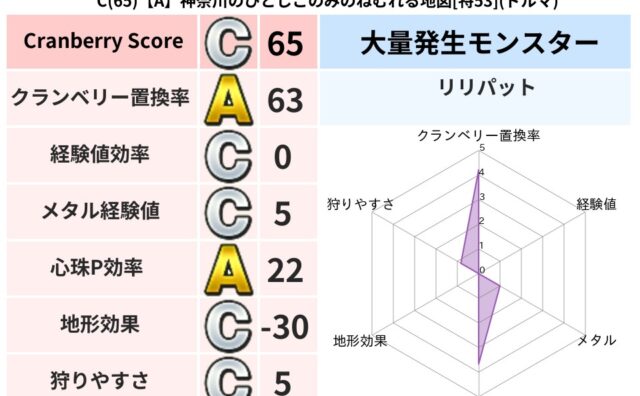 クランベリーボット判定結果の詳細クランベリースコア:111クランベリー置換率:62%大量発生モンスター:リリパットヒャド超耐性(0%)こころ道 完全一致モンスターさまようよろい: ゴッドハンド(守護道Lv5)フレイム: 守り人(ささえ道Lv...