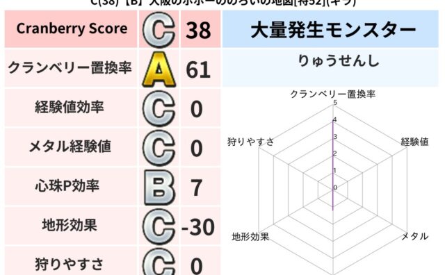 クランベリーボット判定結果の詳細クランベリースコア:87クランベリー置換率:66%大量発生モンスター:バアルゼブブギラ超耐性(0%)こころ道 完全一致モンスターがいこつ: 魔剣士(共通Lv1)ストーンマン: ゴッドハンド(守護道Lv5)リカ...