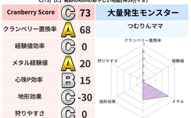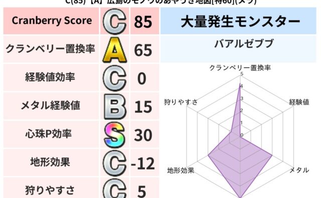 クランベリーボット判定結果の詳細クランベリースコア:122クランベリー置換率:77%大量発生モンスター:リリパットヒャド超耐性(0%)こころ道 完全一致モンスターヒートギズモ守り人(ささえ道Lv5)かっちゅうアリ魔人(共通Lv1)ストーンマ...