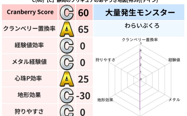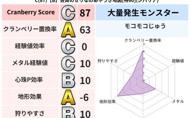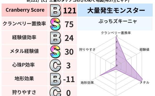 クランベリーボット判定結果の詳細クランベリースコア115クランベリー置換率60%大量発生モンスタータホドラキー超耐性ドルマ(0%)系統狩り鳥系43%こころ道 完全一致モンスターがいこつ魔剣士(共通Lv1)ジェリーマン魔剣士(魔道Lv5)タホ...