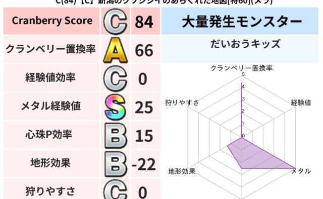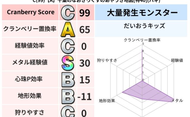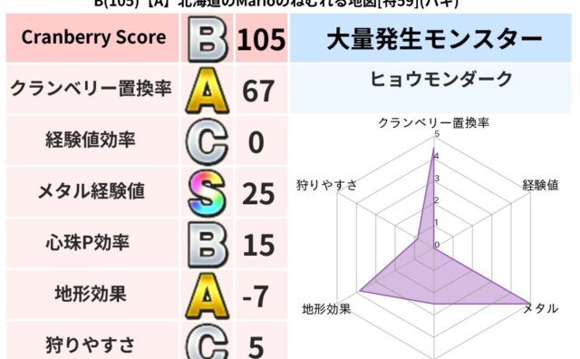 クランベリーボット判定結果の詳細クランベリースコア101クランベリー置換率63%大量発生モンスターナスビナーラ超耐性ジバリア(0%)こころ道 完全一致モンスターみならいあくまニンジャ(風道Lv5)どろにんぎょう守り人(まもり道Lv20)ミイ...