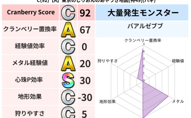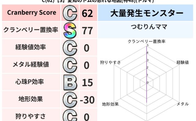 クランベリーボット判定結果の詳細クランベリースコア:118クランベリー置換率:60%大量発生モンスター:ドラゴンキッズデイン超耐性(0%)こころ道 完全一致モンスターねこまどう: ニンジャ(風道Lv5)ヒートギズモ: 守り人(ささえ道Lv5...