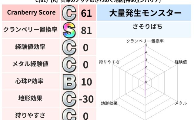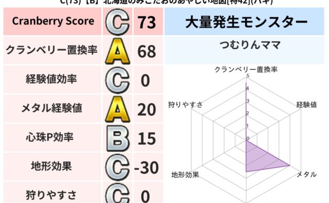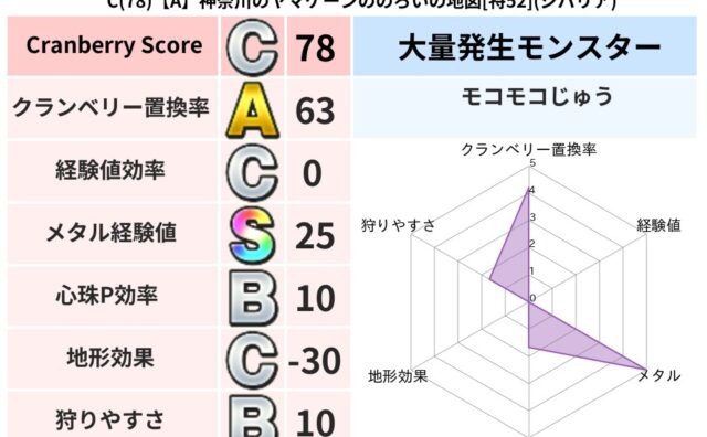 クランベリーボット判定結果の詳細クランベリースコア78クランベリー置換率63%大量発生モンスターモコモコじゅう超耐性ジバリア(69%)こころ道 完全一致モンスターフロストギズモ魔剣士(魔道Lv5)モコモコじゅうニンジャ(波道Lv10)うみぼ...