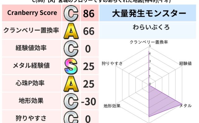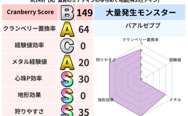 クランベリーボット判定結果の詳細クランベリースコア:138クランベリー置換率:65%大量発生モンスター:リリパットバギ超耐性(0%)こころ道 完全一致モンスターみならいあくま: ニンジャ(風道Lv5)キースドラゴン: 大魔導士(理力道Lv5...