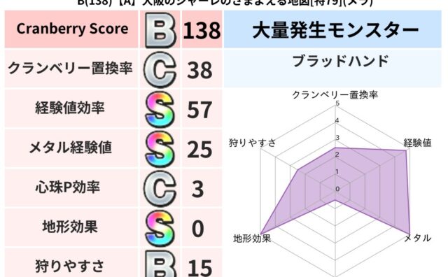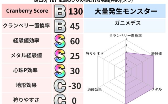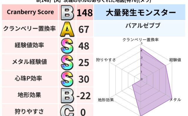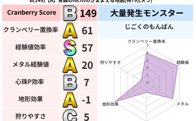 クランベリーボット判定結果の詳細クランベリースコア134クランベリー置換率42%大量発生モンスターマジックフライ超耐性メラ(0%)超耐性・弱耐性なしバギ系統狩り虫系48%こころ道 完全一致モンスターまどうしゴッドハンド(守護道Lv40)シー...