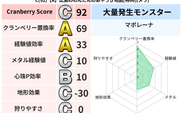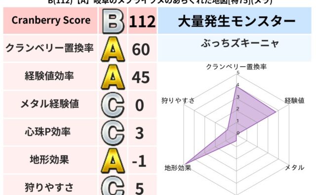 クランベリーボット判定結果の詳細クランベリースコア:127クランベリー置換率:60%大量発生モンスター:ぶっちズキーニャメラ超耐性(0%)超耐性・弱耐性なし:ドルマこころ道 完全一致モンスターねこまどうニンジャ(風道Lv5)どくイモムシニン...