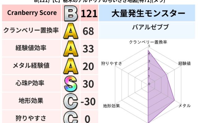 クランベリーボット判定結果の詳細クランベリースコア153クランベリー置換率66%大量発生モンスターリリパット超耐性メラ(51%)系統狩り物質系41%こころ道 完全一致モンスターさまようよろいゴッドハンド(守護道Lv5)パペットマン天地雷鳴士...
