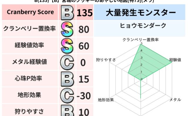 クランベリーボット判定結果の詳細クランベリースコア177クランベリー置換率64%大量発生モンスターわらいぶくろ超耐性メラ(6%)超耐性・弱耐性なしバギドルマこころ道 完全一致モンスタースカルガルードラゴン(竜道Lv5)ブラウニー守り人(共通...